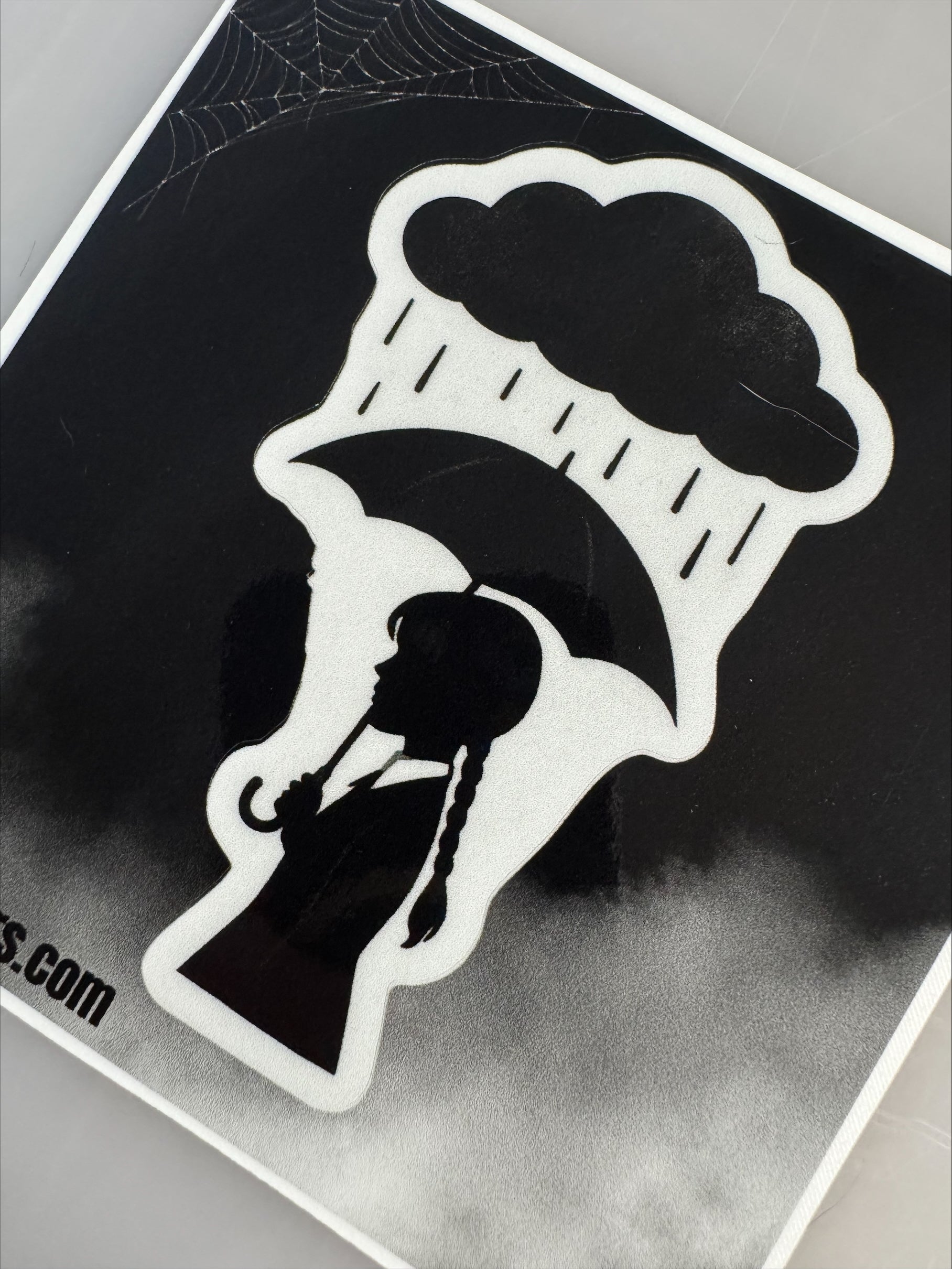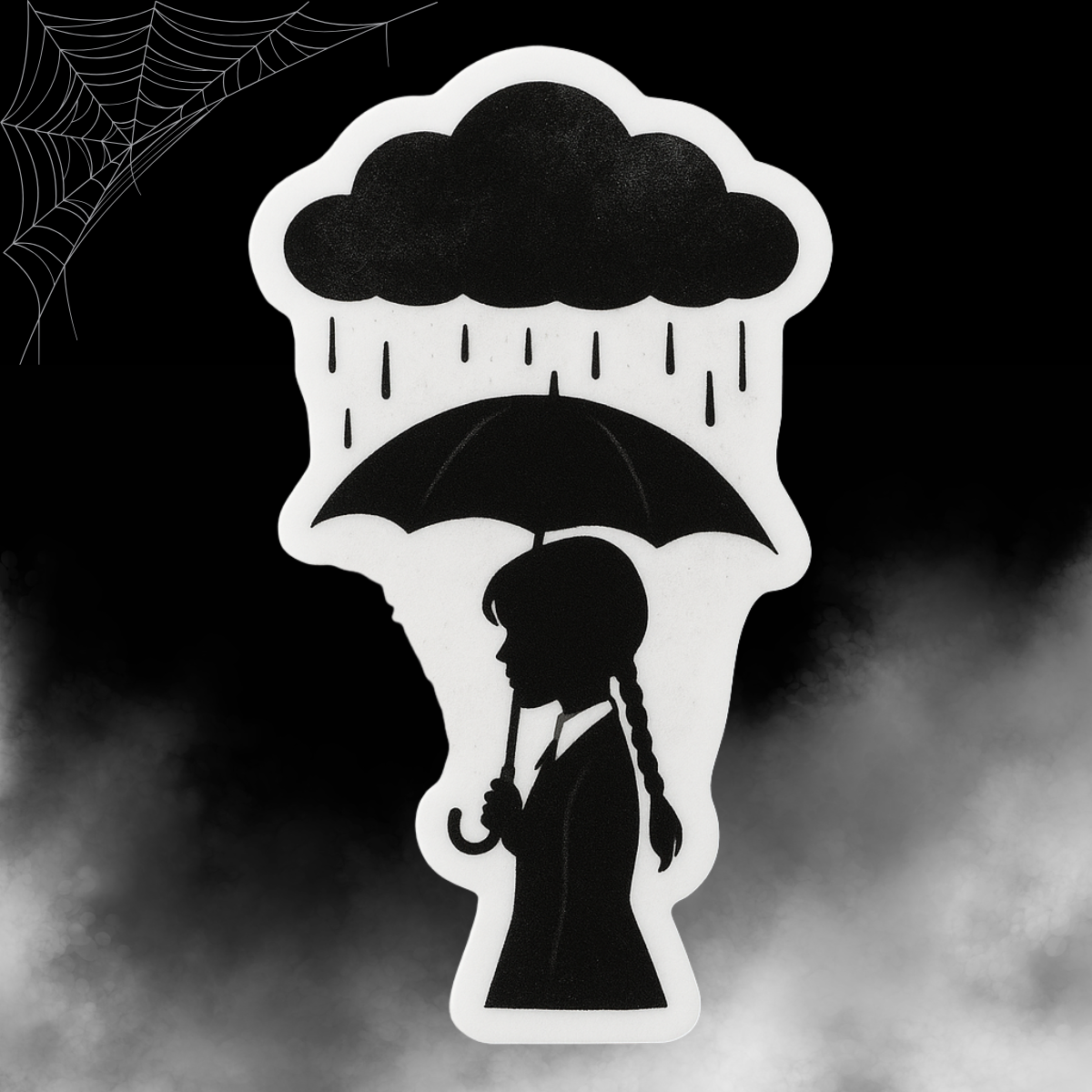 Rainclouds follow her, but she wouldn't have it any other way. This haunting silhouette sticker features a braided goth girl calmly carrying an umbrella beneath a brooding storm cloud 🌧️. A quiet tribute to the beautifully bleak, the emotionally untouchable, and those who thrive in the drizzle of doom 🌫️.