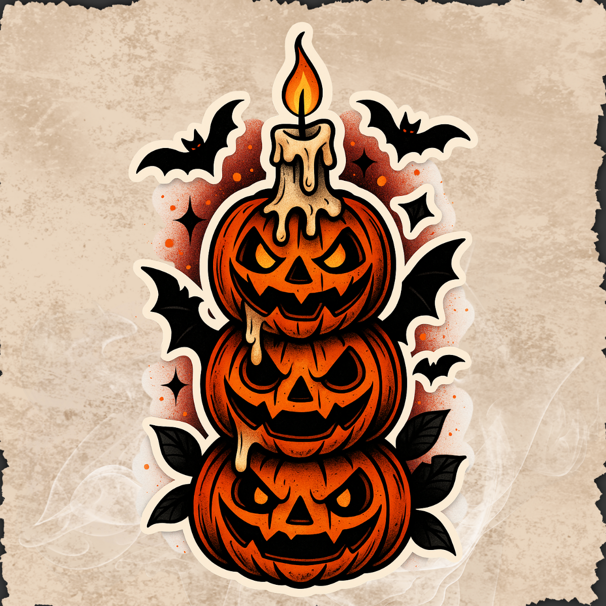 Three grinning jack-o'-lanterns, one melting candle, and a whole lot of haunted energy. This spooky stack burns bright with mischievous eyes, gooey wax drips, and bats circling in the night sky 🕷️✨. It’s the perfect mix of Halloween magic and gothic charm—like a totem of trouble lit by the spirit of spooky season.
